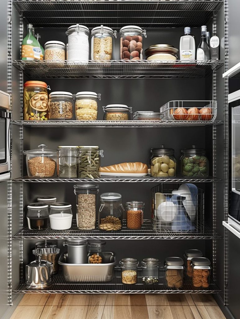 Wire shelving provides a modern and practical solution for organizing your pantry.