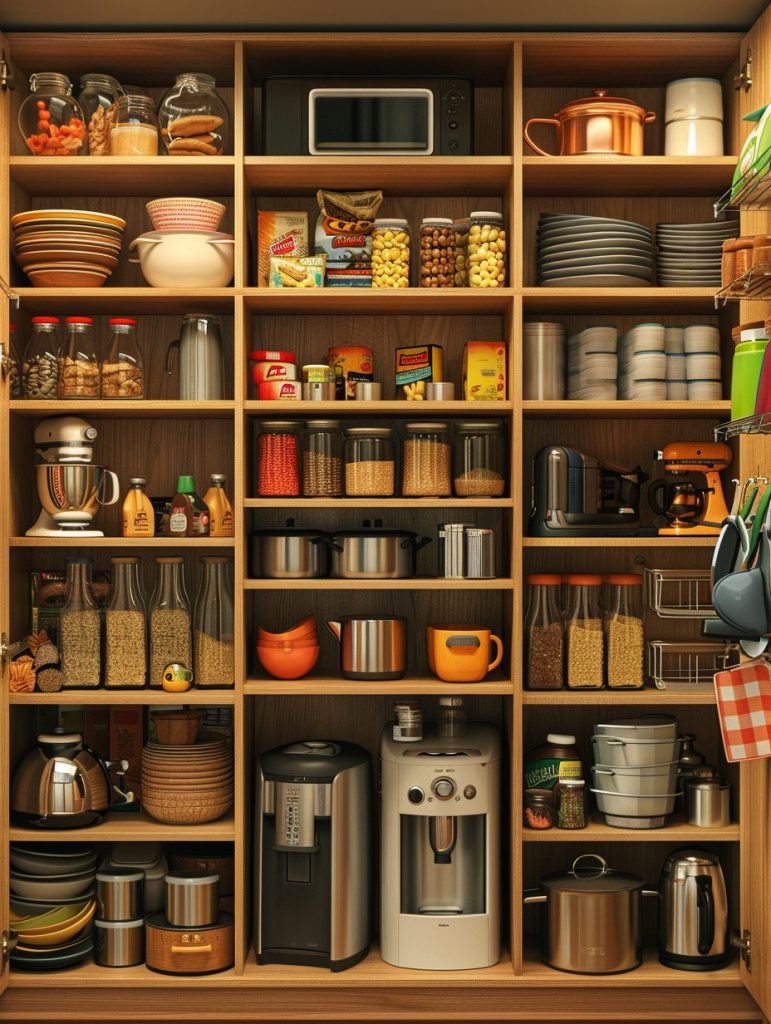Whether it’s boxes of food or compact kitchen appliances, grouping them on these shelves helps enhance organization and keeps your pantry both efficient and tidy.