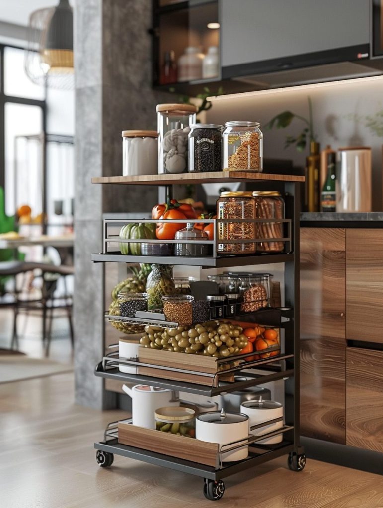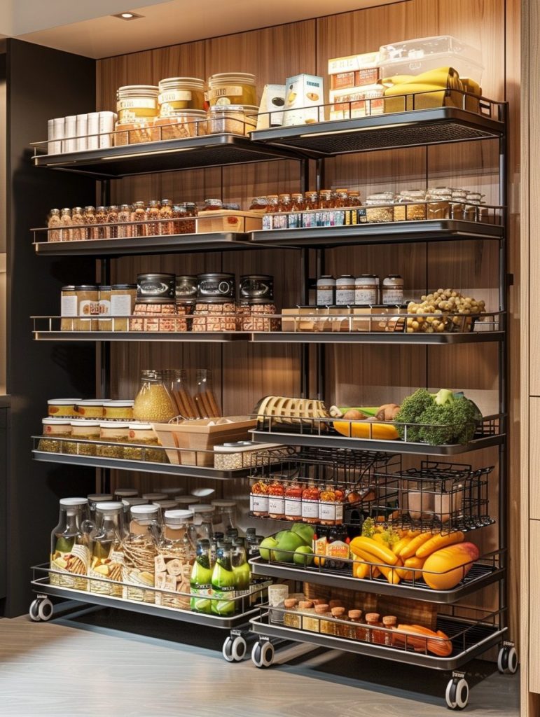 Compact rolling shelves are ideal for tight or narrow pantry areas. They can be pulled out when needed and tucked away when not in use, offering flexible storage without occupying extra space.