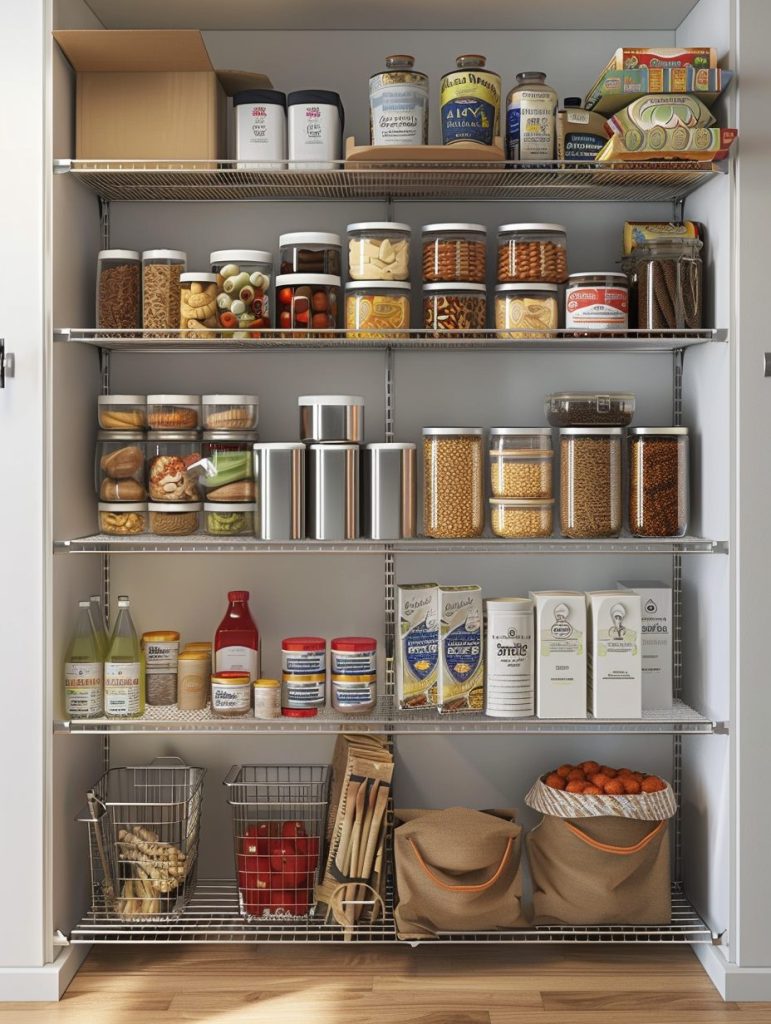 Adjustable wire shelves are a practical and modern choice for pantry organization. Their height can be easily changed to accommodate items of various sizes.