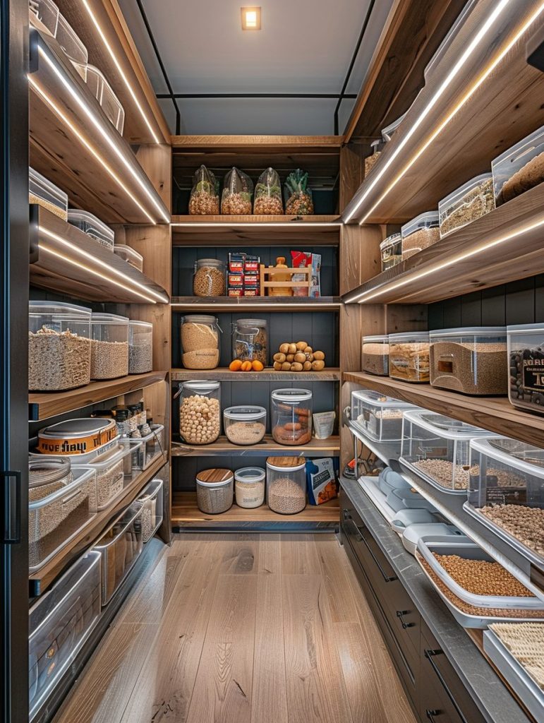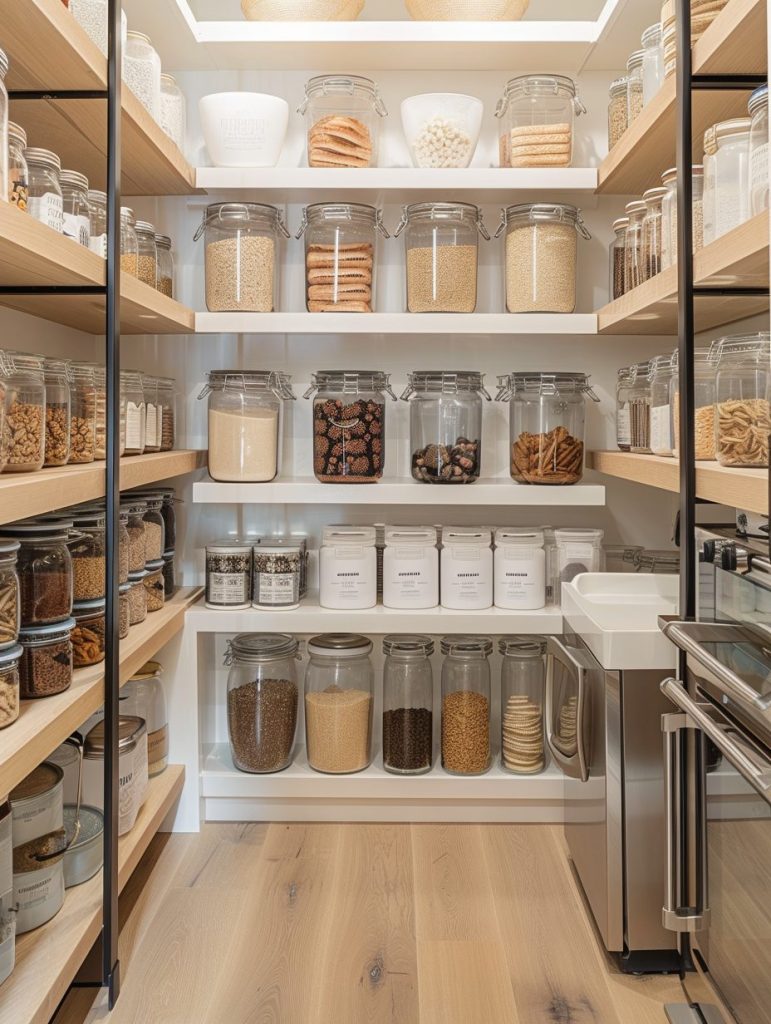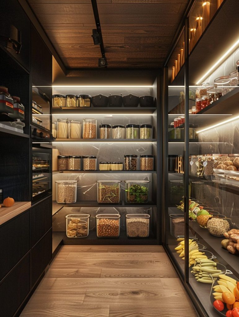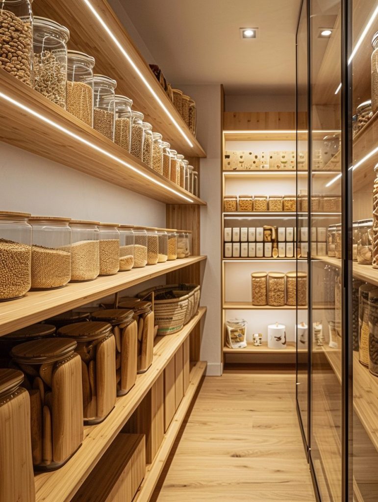 Sustainability is increasingly important in modern pantry design. Choose eco-friendly materials like bamboo or recycled plastic for shelving and storage. Store dry goods such as cereals and grains in reusable glass jars to reduce waste.