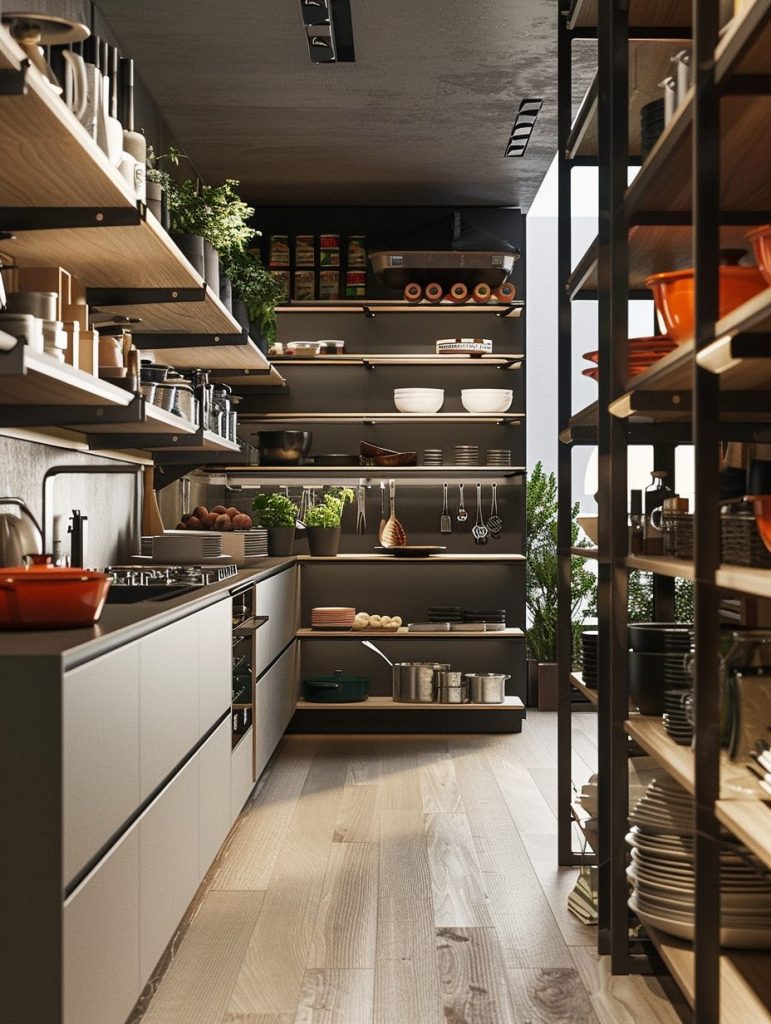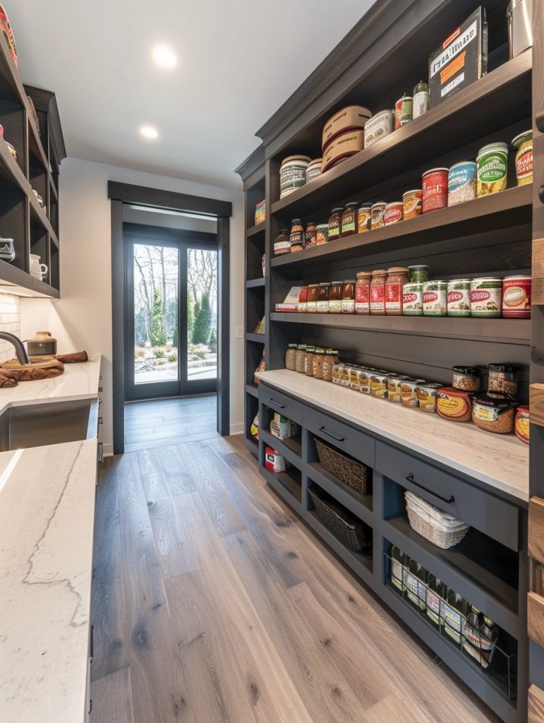 Open shelving in a walk-in pantry offers the dual benefit of visibility and accessibility. With everything in plain sight, it’s easier to locate frequently used items quickly.