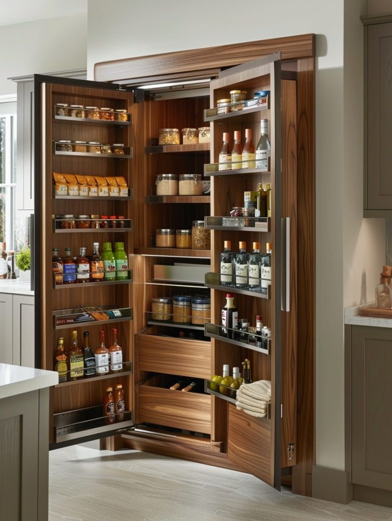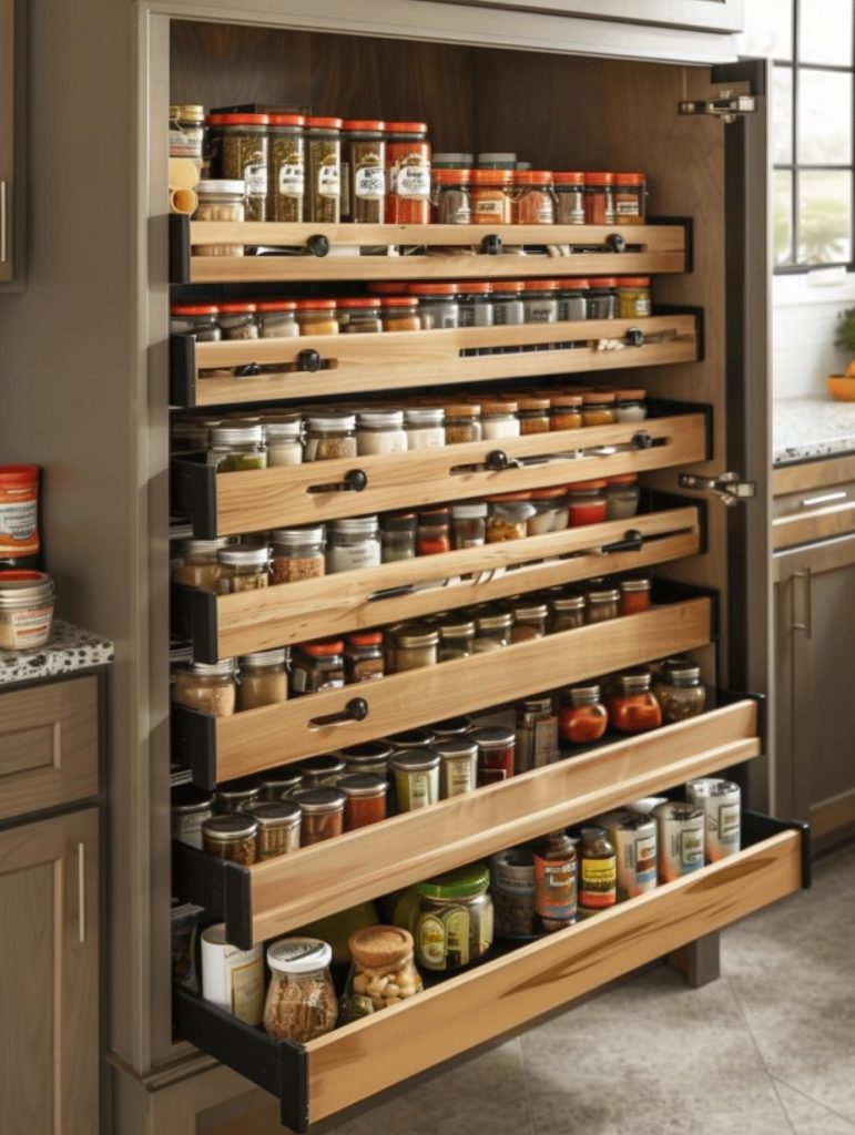 Keep your pantry neat and efficient by organizing spices in dedicated, space-saving storage. Wall-mounted or pull-out spice racks are excellent choices that maximize space and keep everything accessible.