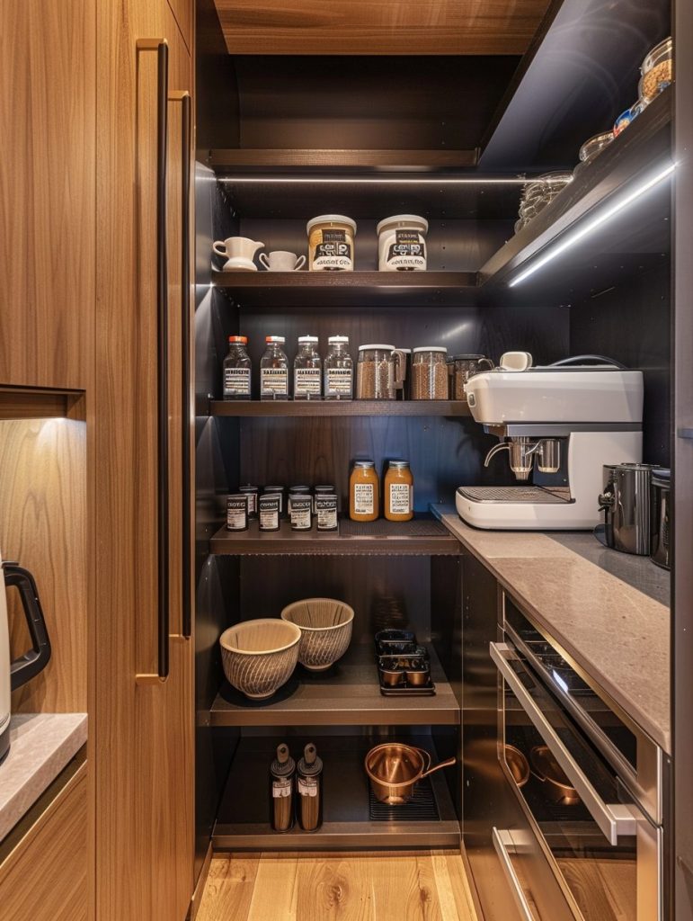 Creating a beverage station in your walk-in pantry is both practical and refreshing. Dedicate a section for coffee, tea, and other drinks, complete with a spot for a coffee maker, mugs, and beverage supplies. Add display boards or shelving for easy access and organization.