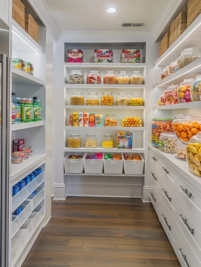 Creating a kid-friendly zone in your walk-in pantry promotes independence and makes it easier for children to grab their own snacks.