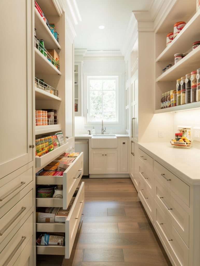 Pull-out drawers are a smart addition to any walk-in pantry, offering easy access to items stored at the back of deep shelves. These drawers come in customizable configurations, making it simple to organize everything from canned goods to baking supplies efficiently.